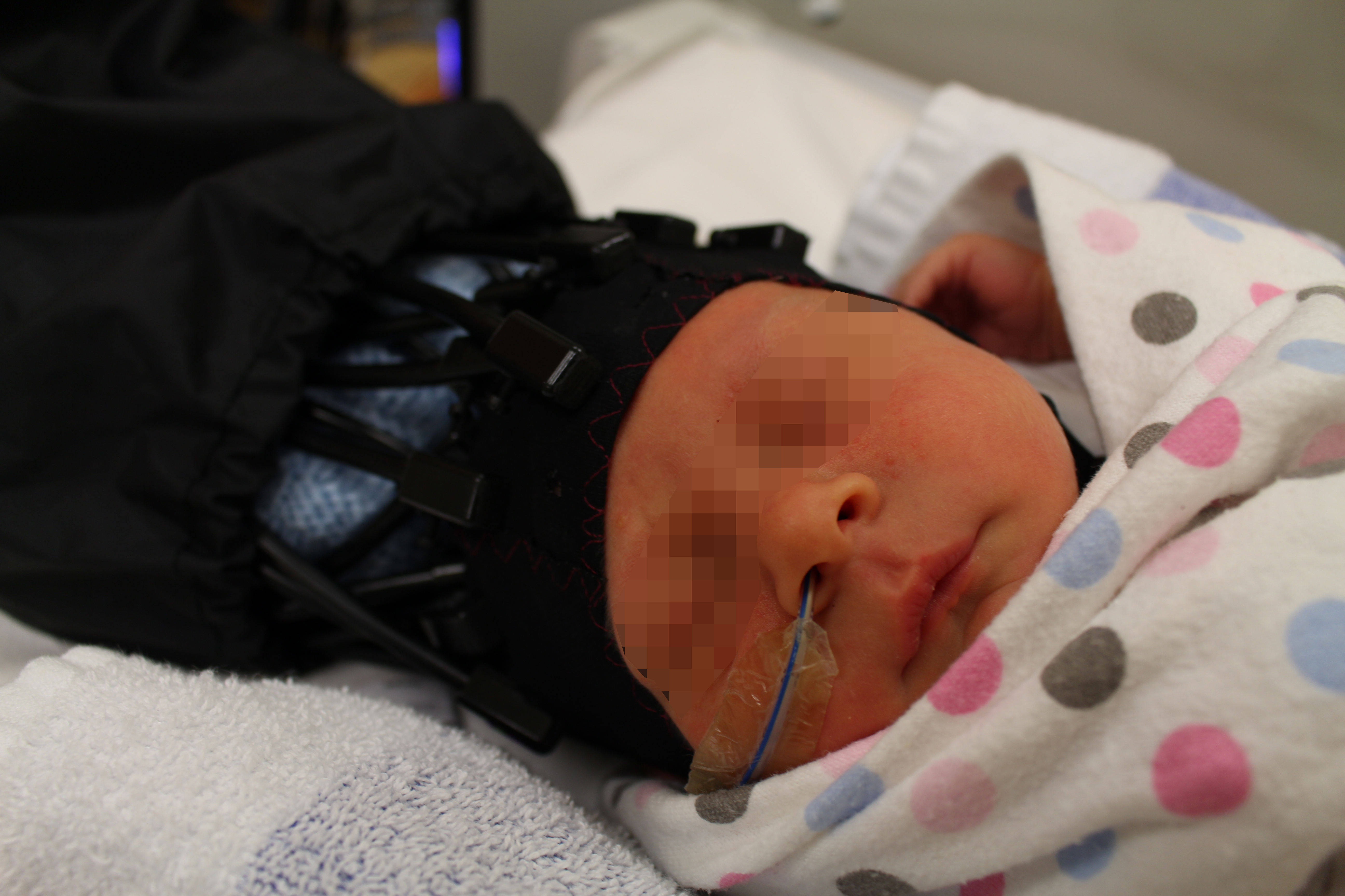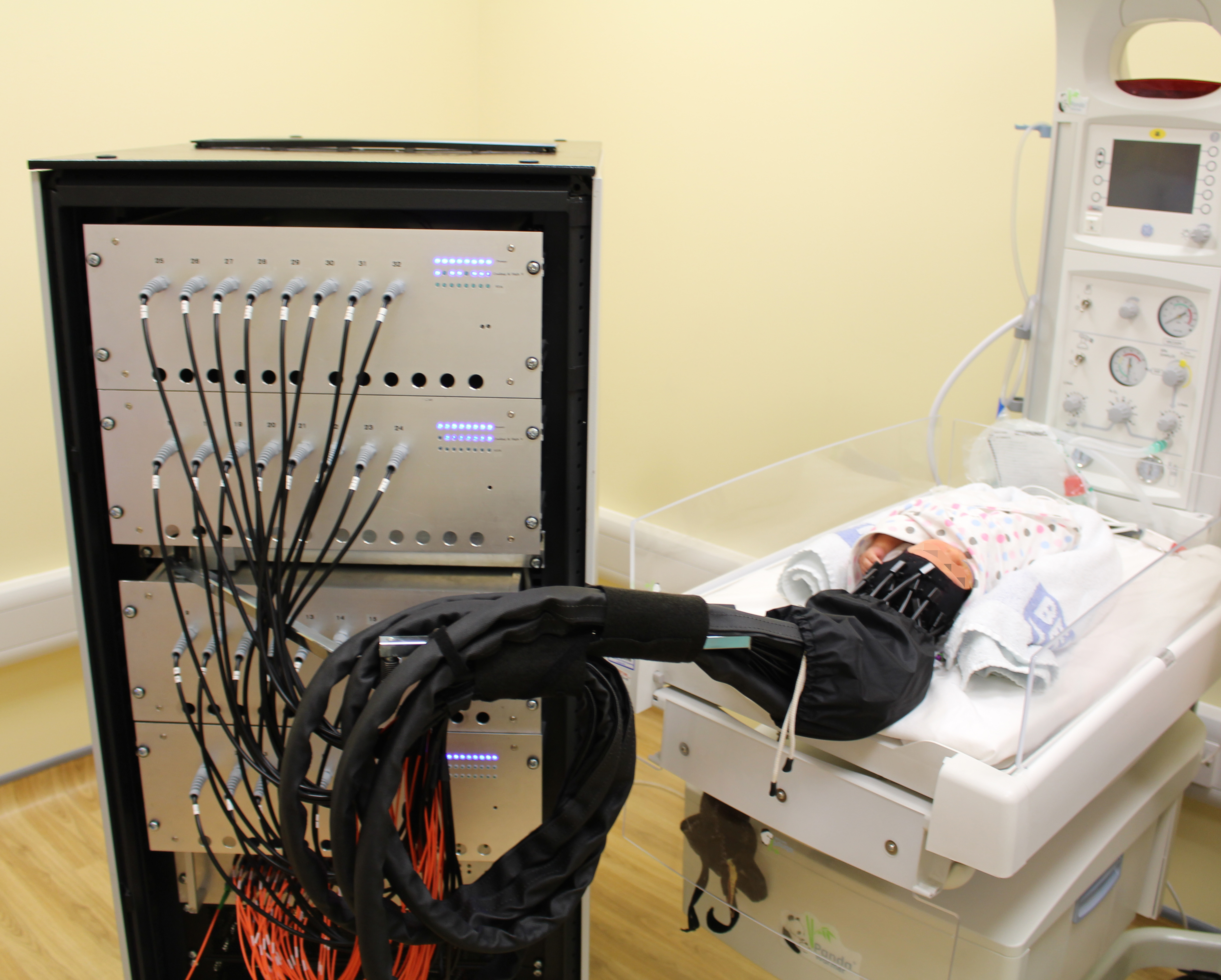 The optical imaging scanner, known as MONSTIR 2 – Multichannel Optoelectronic Near-infrared System for Time resolved Image Reconstruction – was developed by the Biomedical Optics Research Laboratory at UCL (see here for information on the original instrumentation). The scanner was transferred to the Rosie at the end of 2014. The light sources and detectors attach to the infants head using a similar cap to the optical-EEG system. Preliminary test studies on adults have been completed and we have begun to scan infants in 2015.